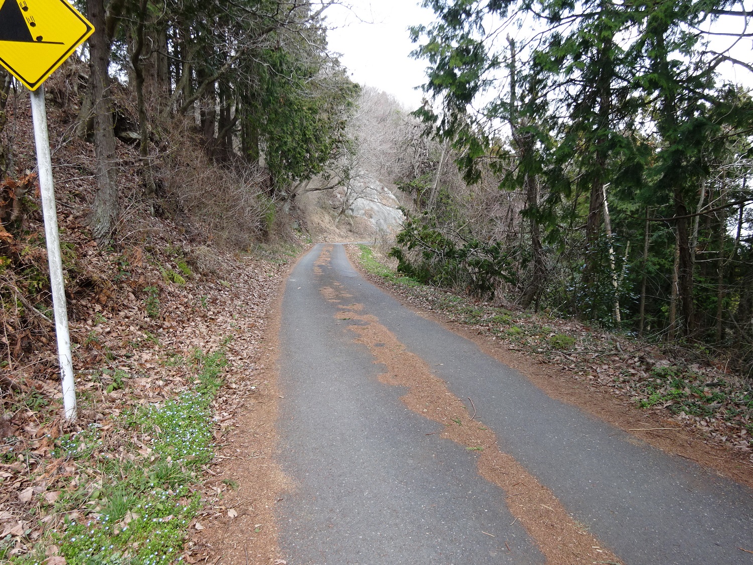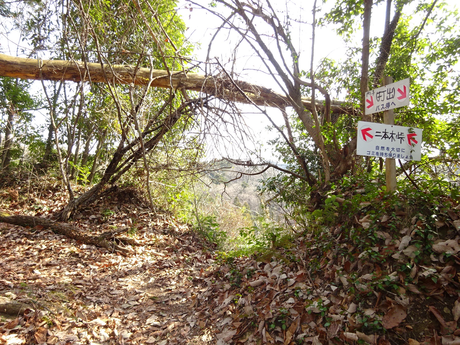 雑木林の間を下りていき、舗装路の向こう側にまたハイキングコース。