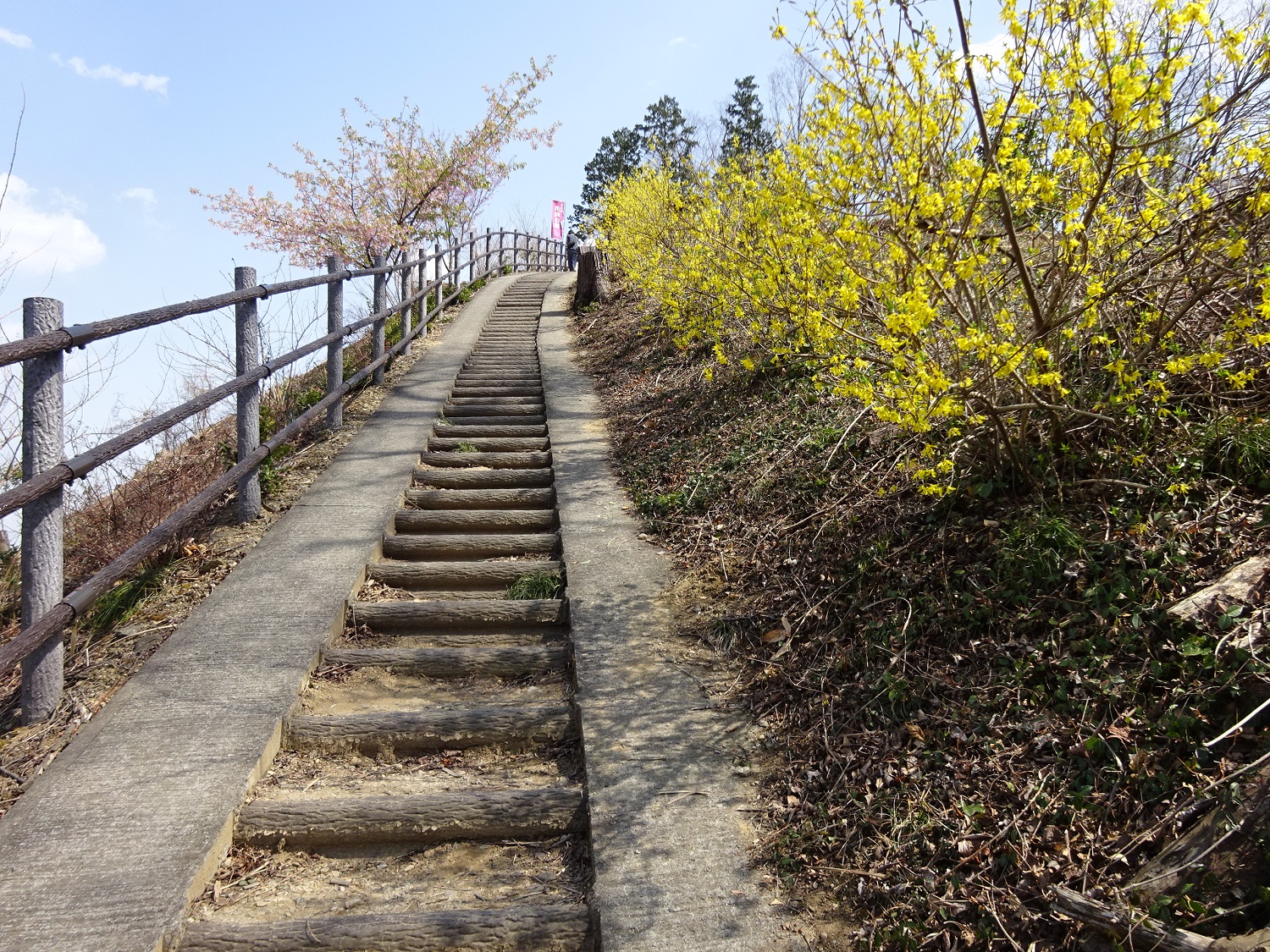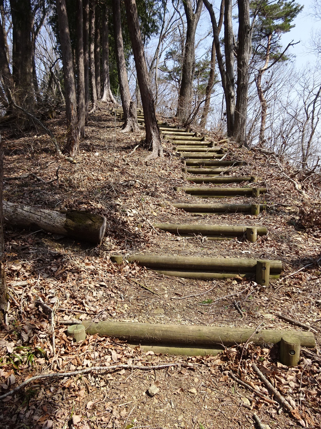 明るい雑木林をどんどん進むと階段が。