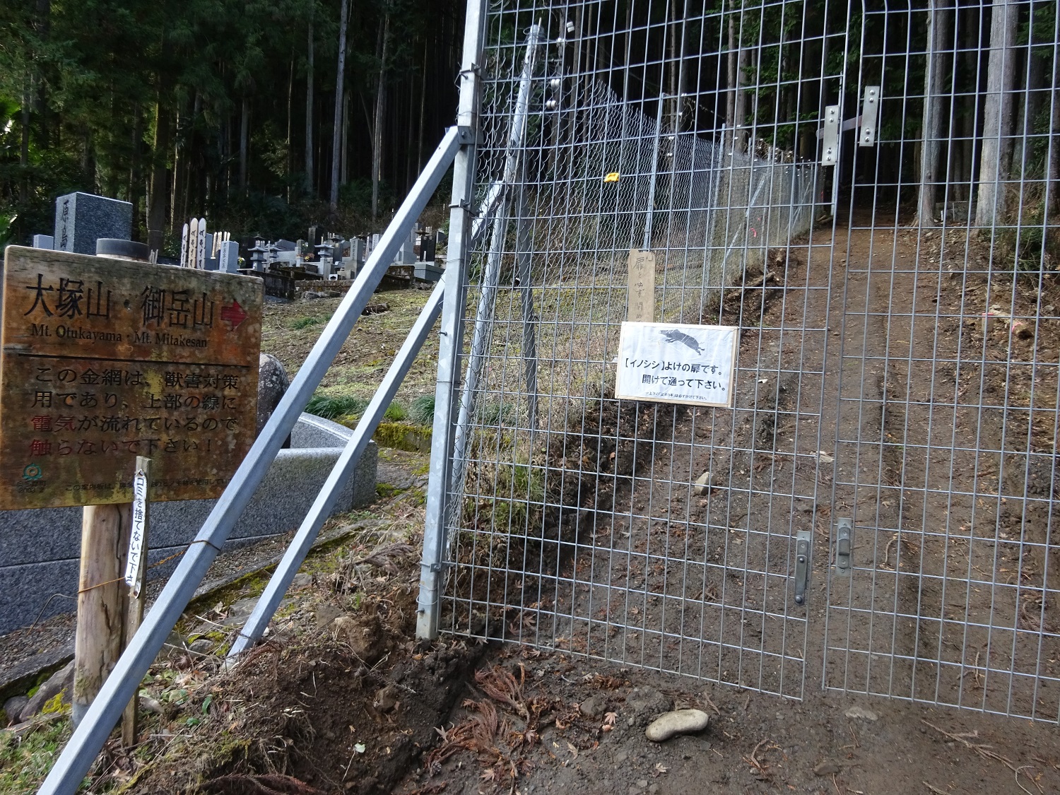 民家やお墓の横を抜けて進むと、イノシシ避けの柵。